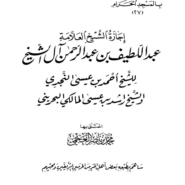 كتاب إجازة عبد اللطيف بن عبد الرحمن آل الشيخ لأحمد بن عيسى النجدي وراشد بن عيسى المالكي البحريني PDF من كتب علوم الحديث، يشرح مصطلحات المحدثين وقواعد الجرح والتعديل وضوابط قبول الرواية.