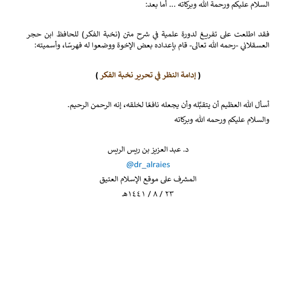 كتاب إدامة النظر في تحرير نخبة الفكر لعبد العزيز بن ريس الريس PDF