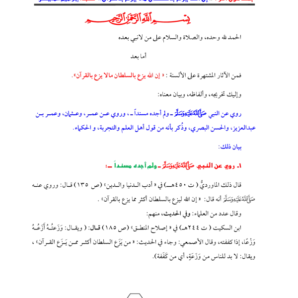 كتاب بحث حول أثر إن الله يزع بالسلطان ما لا يزع بالقرآن لإبراهيم بن عبد الله المديهش PDF